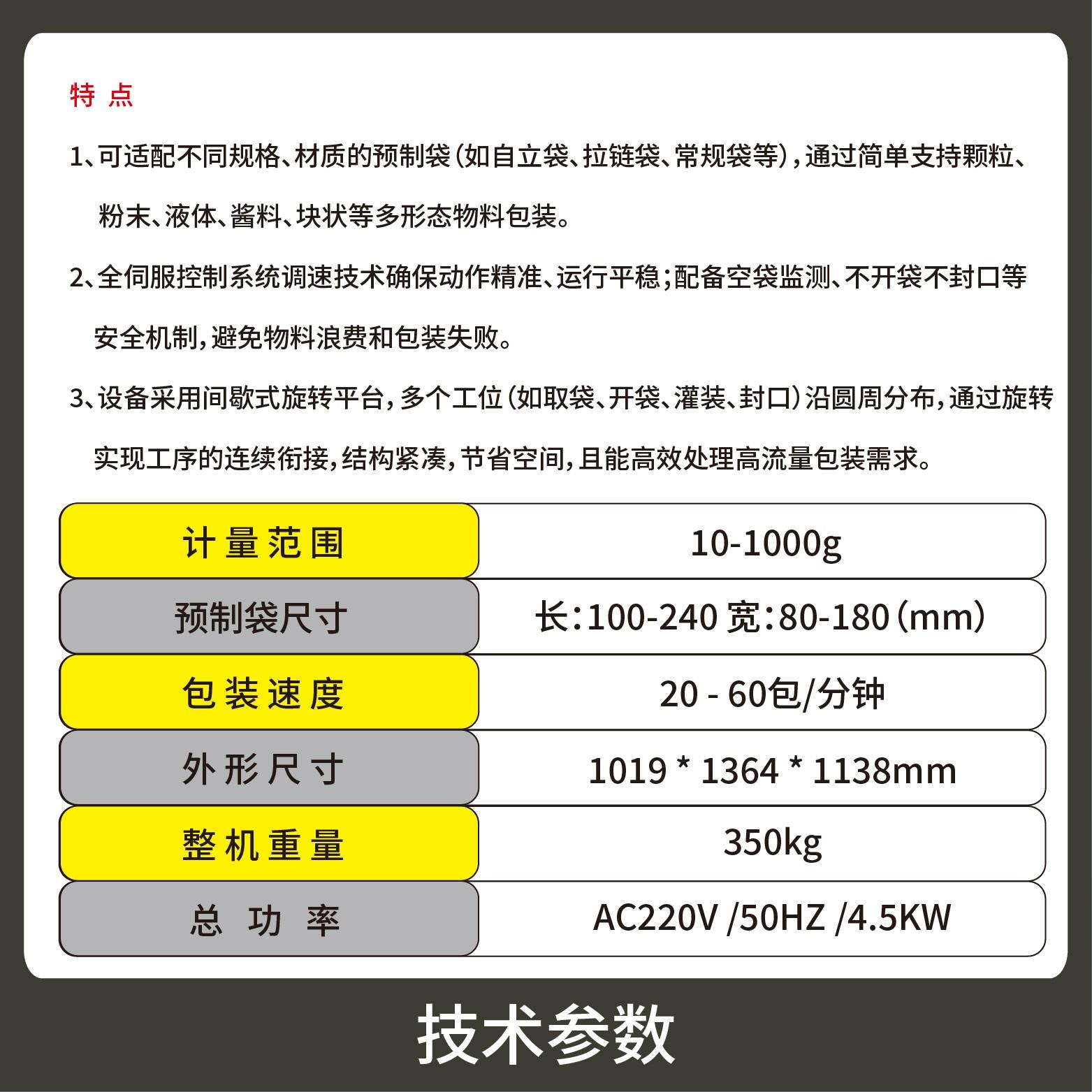 1、可適配不同規(guī)格、材質(zhì)的預(yù)制袋(如自立袋、拉鏈袋、常規(guī)袋等),通過簡(jiǎn)單調(diào)整即可切換袋型,速度快、效率高,穩(wěn)定性好;支持顆粒、粉末、液體、醬料、塊狀等多形態(tài)物料包裝。